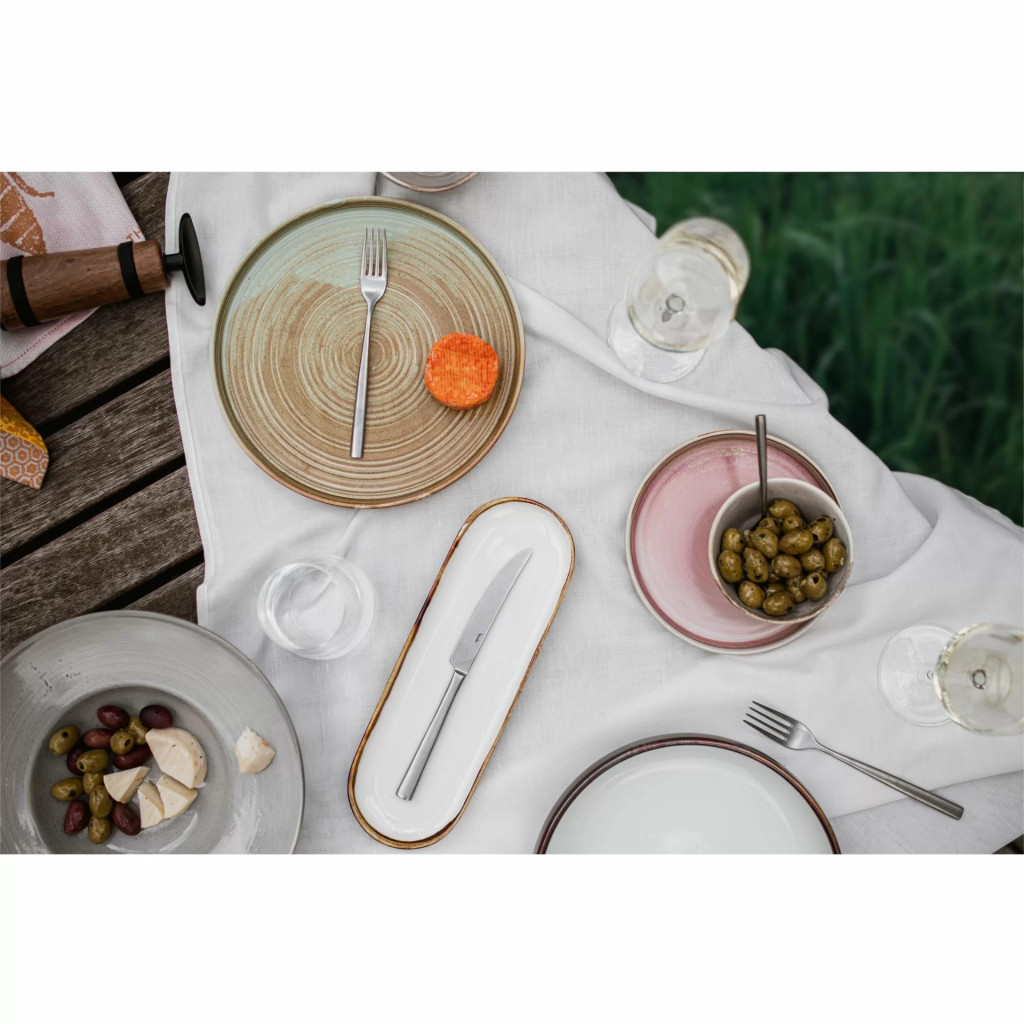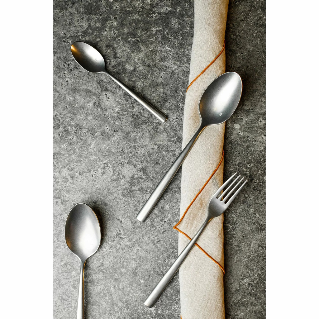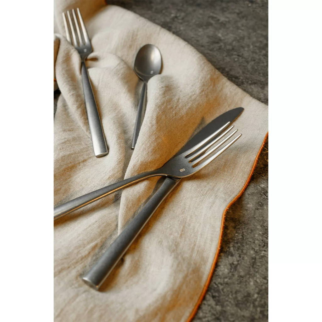 Ha értékeled az egyszerűséget egy kis csavarral, ez a kollekció neked való. Tökéletesen kiegyensúlyozott, jól meghatározott, éles, hosszú villák, valamint a felső rész sima átmenete a nyélhez vizuális könnyedséget kölcsönöz ennek a kollekciónak. A használati részen látható gravírozás, az acél típusát jelző jellel, elegáns vizuális hatást biztosít. A kés nagy vágófelülete jól elkülönül a nyéltől, így kényelmes az evés. A matt, „antikolt” acél hatású felület pedig különleges, modern stílust kölcsönöz a belső térnek.